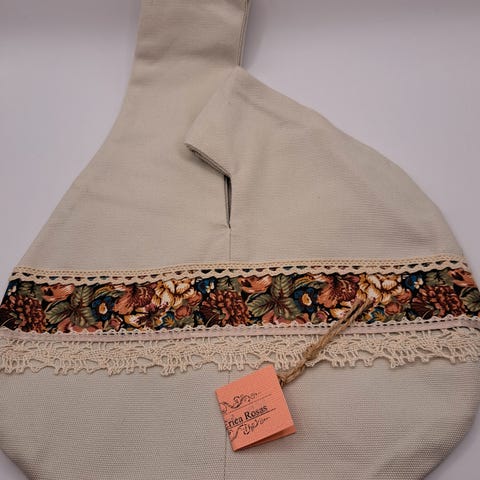 Hjemmelaget knot bag i stoff. Målene ca. 24x32 cm.