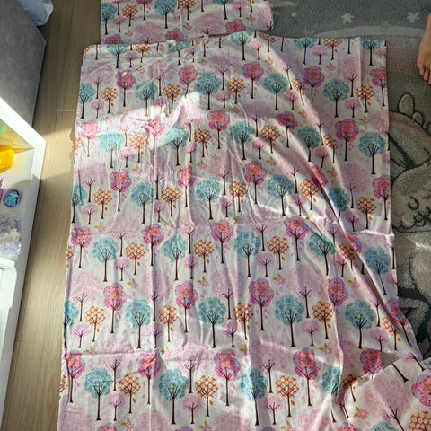 Alt er pent brukt og i god stand. Madrassbeskytteren har to flekker, ellers er alt uten flekker, rifter eller hull.