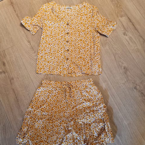 Toppen er i størrelse M og buksen i størrelse S.