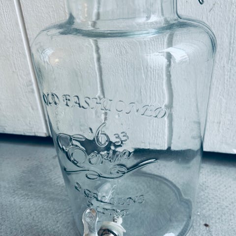 Stor glassbeholder med kran, super til fest, og fantastisk til kald drikke om sommeren! Lokk med gummiring og bærehåndtak.
