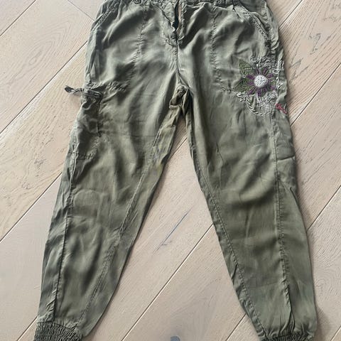Flott bukse fra Odd Molly selges. Str 3 som tilsvarer Large. Fine detaljer, med mange lommer og broderier. Laget av 65% viskose og 35% bomull. Veldig myk og god bukse. Litt strikk i livet i tillegg til knytebånd. Kort modell. Jersey-stoff nederst på bena. Brukt en del, men fortsatt veldig fin.