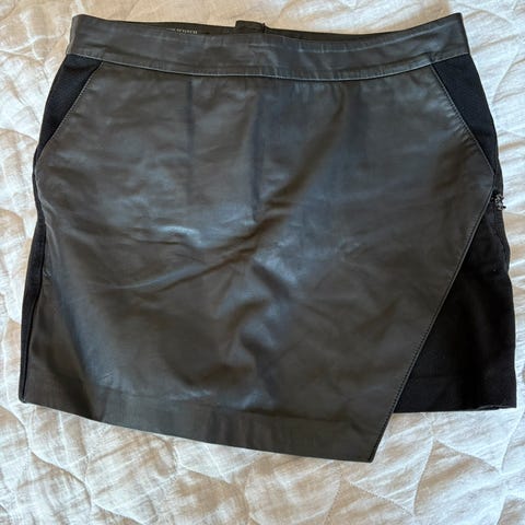Lekkert skjørt fra Helmut Lang i blanding av semsket skinn og jeansstoff. Rålekkert! Passer str S. Svært lite brukt, ingen bruksmerker.