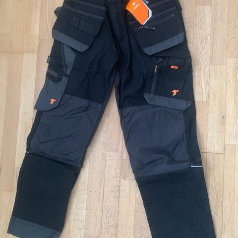 Ny uåpnet arbeidsbukse. Timbra classic str 56 svart. Strategisk plasserte stretchpsneler, forsterkninger hengelommer og ben, kneputelommer i Nylon Cordura.