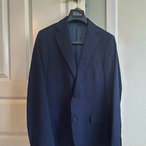 Jakka er str. 40 og buksa er str. 40 C1 og passer til en smal gutt. Personen på bildet er ca 160 høy.