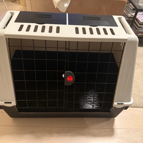 Godt og solid bilbur til mellomstor hund. Vår golden retriever vokste ut av det da hun var rundt 15-20 kg. Brukt av oss kun noen måneder. Noen kloremerker på innsiden etter forrige eier, men det er malt over og er knapt synlig.