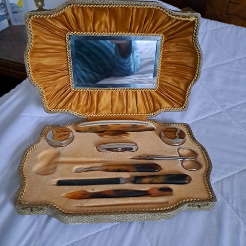 Gammelt futeral, med børster og små glass, manikyr- sett.