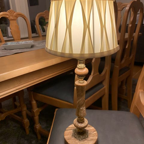 Lampe og skjerm er rengjort og klar til bruk. Skjermen er vasket. Den hadde opprinnelig et for inni men det var litt ødelagt og dermed fjernet jeg det. Bare så det er nevnt. Antar at skjermen også er fra -70/80 tallet da disse var svært vanlige.