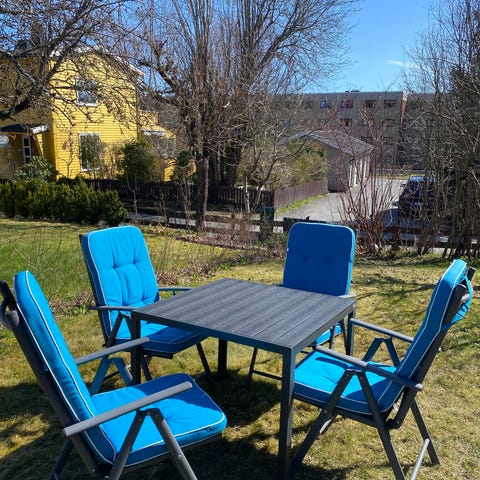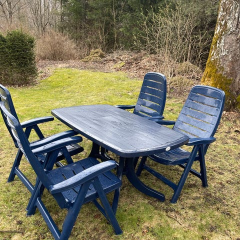 4 regulerbare stoler og et avlangt bord. Stolene er sammenleggbare, men ikke bordet.