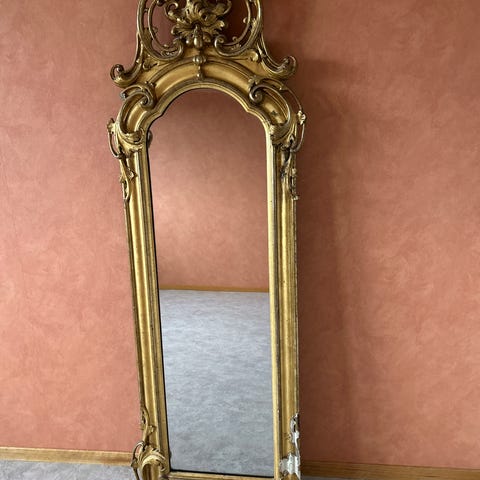 Eksklusivt gammelt speil i gullforgylt ramme og nydelig pynt.