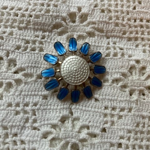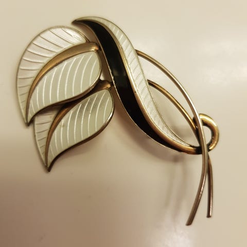 1 bortimot feilfri emalje/sølvnål med liljekonvall (925) fra A.Scharning. Ca. 5 cm lang . 2 millimeter små merker nederst i buen - trolig fra produksjonen. 2 små merker på undersiden av liljekonvallen, men mulig dette går bort med pussing - selges kr 500,-