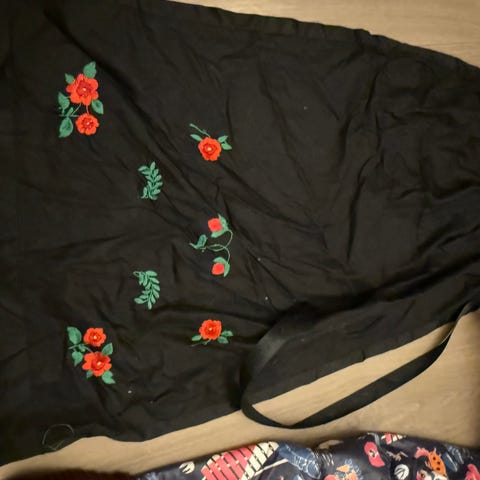 Eldre bunadsforkle i sort ull med brodert mønster. Til Rondastakk, ca str S dame eller ung voksen. Se mål på bildene.