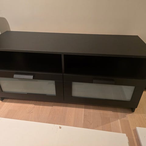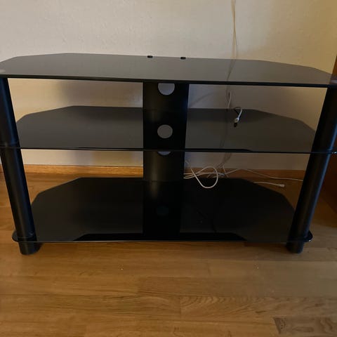 Pent brukt TV-benk med glassplater. Ingen synlige merker.