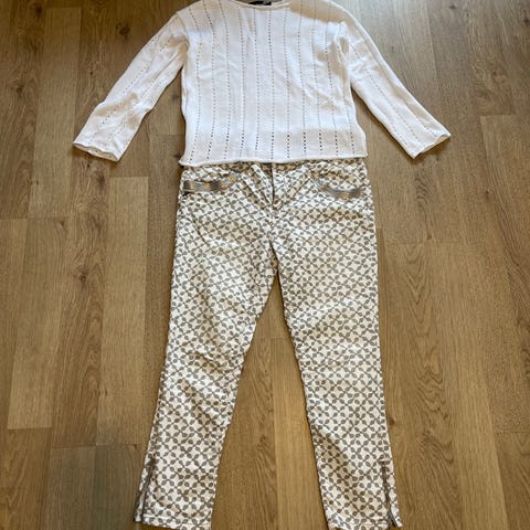 Hvite bukser i bomull fra Mos mosh. Modellen heter Linton pants. Angitt str 26; livvidde 79cm, livhøyde 24 cm, innerbenslengde 78 cm. Studs innenfor en forlomme, noen av disse mangler; se bilde, ellers strøken.
