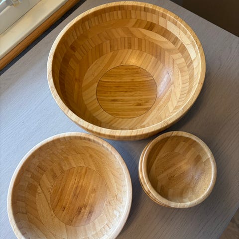 Treverksboller i solid tre og i samme farge. Kjenner ikke til noe annet enn at disse bollene er produsert i Telemark. Fremstår urørt og ny. Solid.