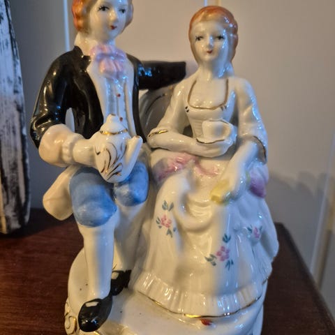 figur av en mann med en hund, mannen sitter på en stor lilla og rosa lenestol med et hjertemotiv