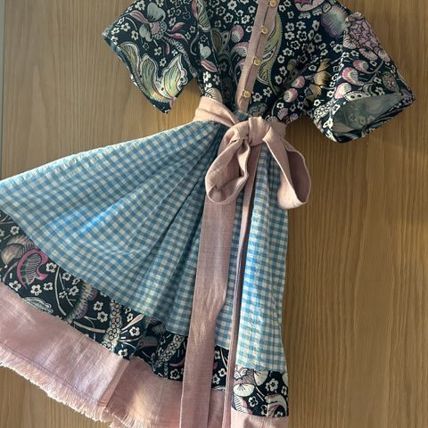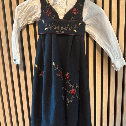 Holder på med en ny festdrakt i str 2 år. Straks ferdig. Skal bare sy forkle og belte. Fin skjorte i marineblå bomull. Str 2 år.