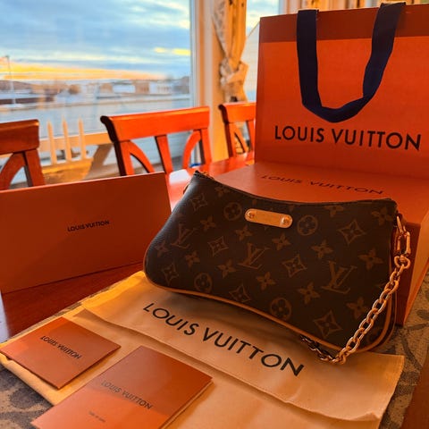 LV capucines clutch vurderes solgt. Kjøpt i 2017, brukt Max 2 ganger og stått mest til pynt. Mål 20x11,3. boks medfølger. Kan hentes på Strømmen eller sendes.