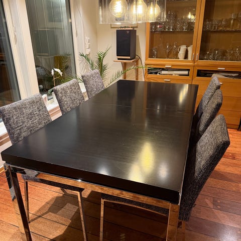 Pent brukt med 6 grå skinnstoler.Alt i fra BoConsept kjøpt hos Skeidar.