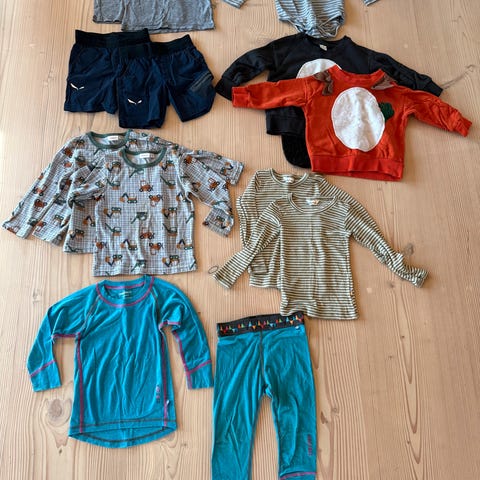 Selges som det er. Newbie genser, vinterdress / vårdress, fleecedress, sommerpysj. Annmerkninger jeg ser; hull på magen på devold tskjorte, malingsflekk på skogstad fleecejakke, 2-i-1 dress treng en vask.