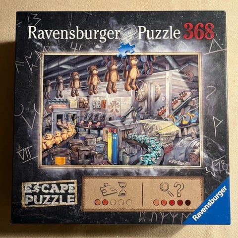 The Escape Room concept is now available as a Ravensburger puzzle! It's up to you to put the puzzle together, find the mysteries and solve them all. Will you be able to solve all of the mysteries and find the "last" puzzle piece? A mysterious illustration plunges puzzlers and players into a mystifying world where it is all about finding the "escape"! The box contains a puzzle with perplexing pieces, one set of instructions and an envelope with the answers!.