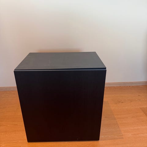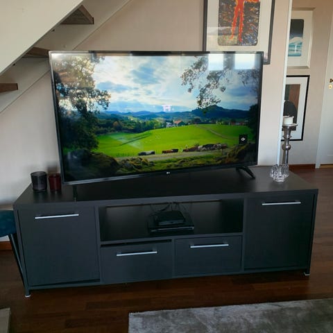 Svart Unnu tv benk med svart stoff dør, vegghengt. Selges for 500kr