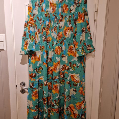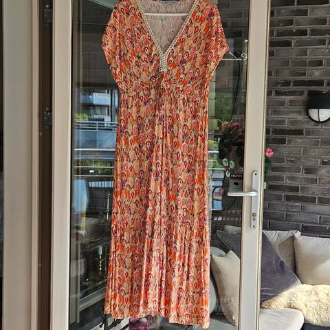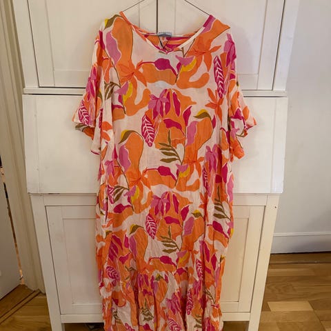 Vakker kjole fra franske Ema Blues. Kjolen har nydelig print I rosa,hvit,grønn,Orange og turkise. Rund hals med flotte detaljer. Lang model med kappe. Påsydd underkjole. Løs og ledig sommerkjole i bomull..Ny og ubrukt.