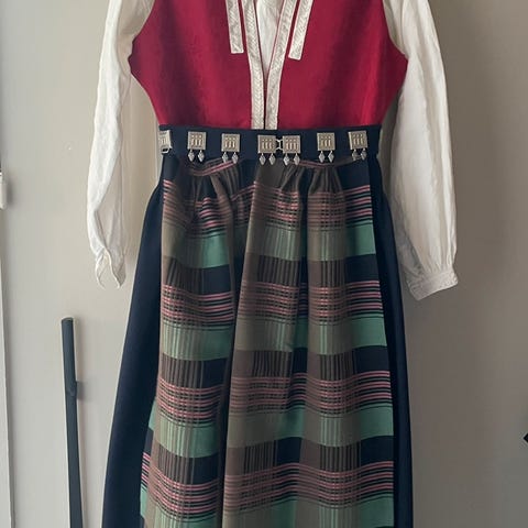 Nordmørsbunad med linskjorte, forkle, veske m/ veskelås og belte m/ sølv. Vest og stakk kan sys inn/ ut og legges opp/ ned.