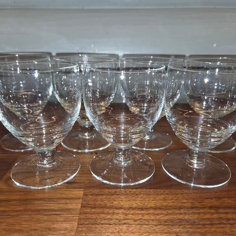 Selger 9 elegante cognac-glass fra Holmegaard, modell “Nyhavn”, med original gullkant. Glassene er ca. 8,6 cm høye og har et klassisk, tidløst design.