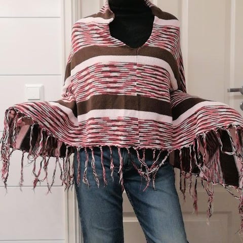 Lang svart poncho med blå stripedetalj og sommerfugelarmer. Håndvevet av Anne-Mette Boger. Noen nupper. Selges 500,- kroner.