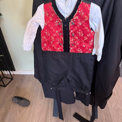 Vi brukte den både ved 1 og 2 års alder. Først med «Bunadsbody» (str. 62/68) og så med skjorte fra Frankies (str. 86). Begge deler følger med hvis ønskelig.