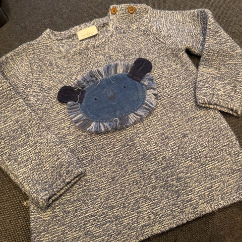 Søt myk brun genser med kaninmønster på framside. Størrelse 86 som passer til baby på 10-20 måneder. H&M.