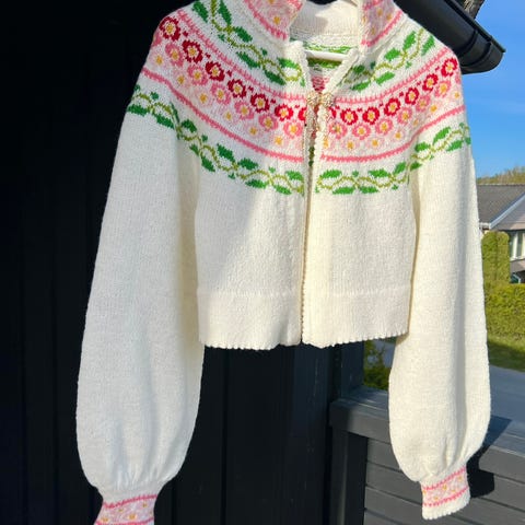 Omslagsjakke i bunadsinnspirert stil . Inspirert av tradisjoner og håndverk fra Øvre Hallingdal. Maskinstrikket og med snøring i livet. Svart bunn. Tilsvarer størrelsen L.