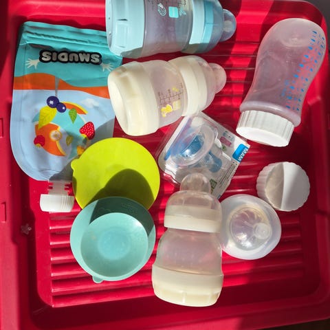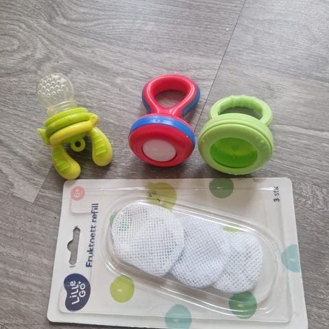 Matesmokker til baby. 3 stk, men kun 2 lokk. Noe misfarging.