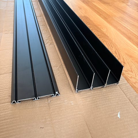 Noen rester etter montering av skyvedører. En del kapp av hjullister oppe og nede, monteringslist og to hele tak dekklister.