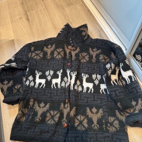 Som ny. Lang og oversized, med Palestina mønster nede på ermene. Merke heter ANZ, en London basert designer