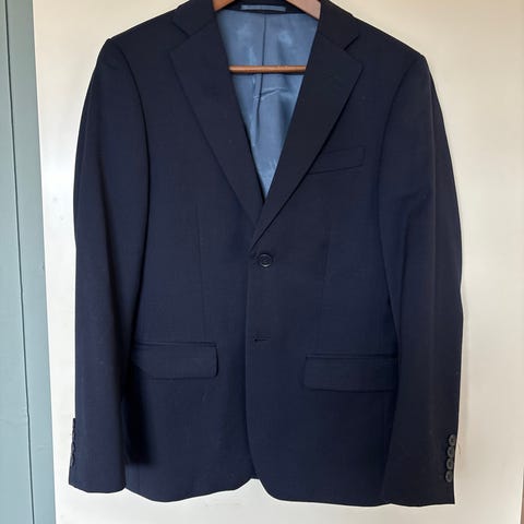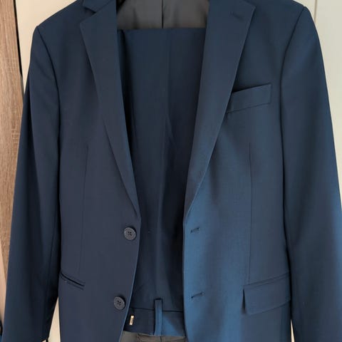 Hel fin mørkeblå dress med jakke og bukser i storrelse 44. Fra Dressmann. Brukt to ganger og selger den nå da den har blitt for liten. Passer til en tynn gutt som vanligvis bruker S eller XS i klæer.