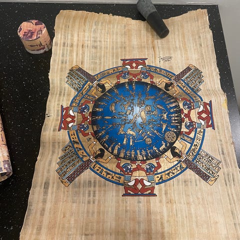 Papyrus kjøpt i Kairo for en del år tilbake. Hel størrelse: 35x21 cm, størrelse selve motivet: 19,5x14,5 cm.