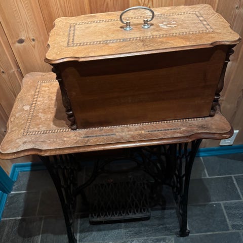 Antikk Phoenix symaskin med bord og diverse utstyr