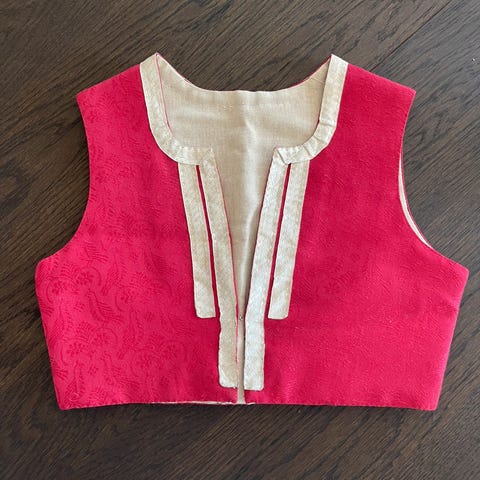 Pent brukt vest i "fuglety" ulldamask i fargen vinrød (plommerød/gammelrosa) selges.