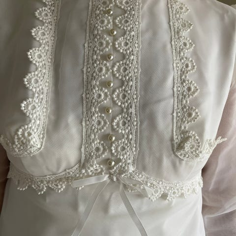 Lang brudekjole i 100%silke. Silkeknappwr og nydelig blonde i forstykke. Sydd hos skeddder. Str S eller 36. Strikk i livet og bredt silkebelte som kan knytes rundt