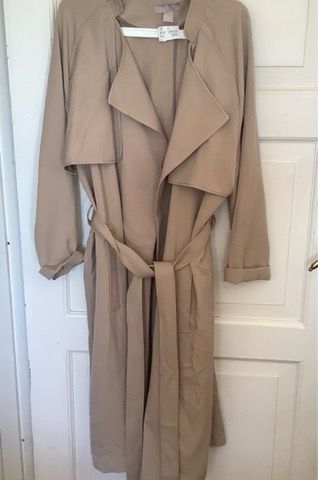 Fin trench i beige. Medium. Strikk i ryggen og belte. Pent fall. Viskose og polyester. Sender mot at kjøper betaler frakt.