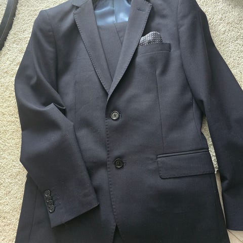 Stilren Grå dress ; bukse + jakke med tørkle i lomme.