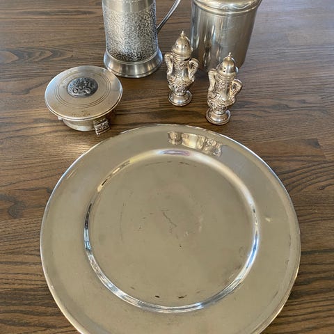 Hamarhistorie til salgs. Stor, gammel tine fra E. J. Berghs bakeri med svidekor. Diameter 40cm. Høyde 20 cm uten lokk.