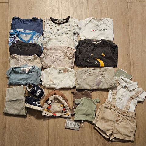 Klespakke med 15 plagg i str. 56 (body, bukse og pysj)