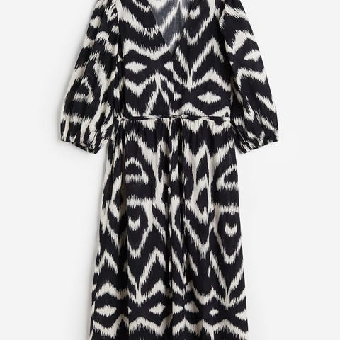 Skjortekjole i lin og bomull med grafisk print i svart og hvit. Snøring i begge sider i livet, og splitter i siden.