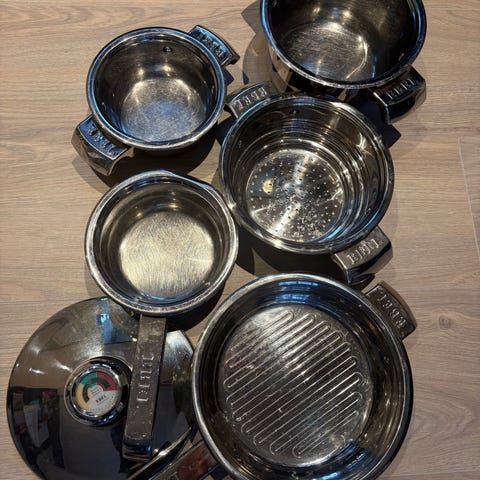 Selger 2 stk emaljerte kjeler med lokk. Den ene er litt brent i bunnen, men fortsatt funksjonell. Pene og dekorative kjeler. Selges samlet.