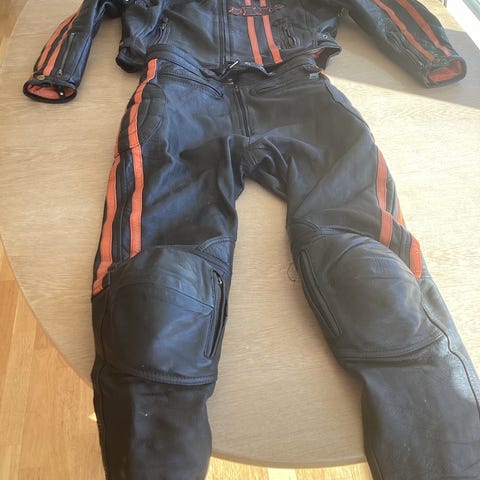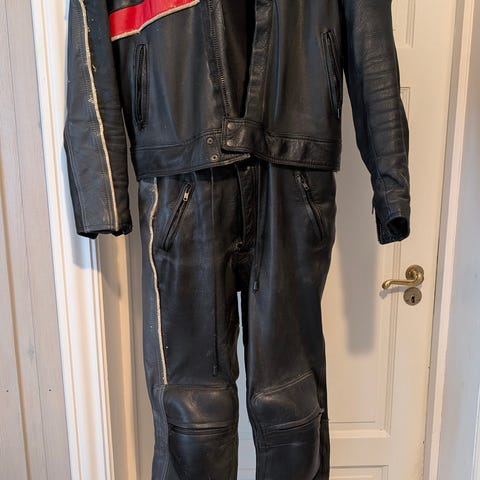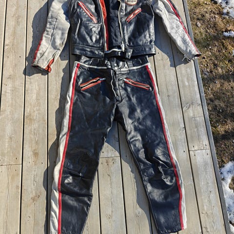 Denne er fra 1977 og er med «polstring «på albuer / skuldre og knær , rød jakke m / hvite / sorte striper og sort bukse.