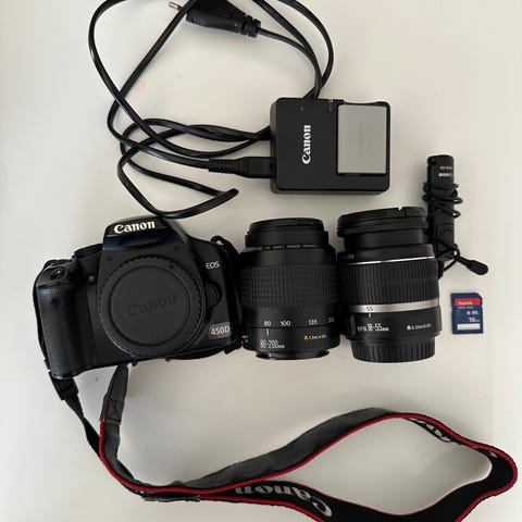 Canon EOS 450D med batteri, lader, kameraveske, filter , bruksanvisning, videokabel, og minnekort.