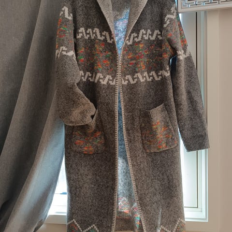 En hjemmestrikket cardigan, vanskelig å si størrelse - men tror det er en XL.