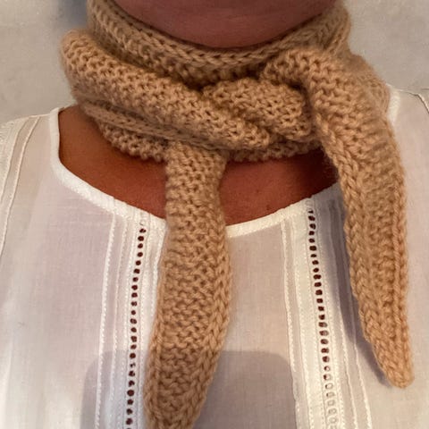 Sophie scarf strikket i Popcorn fra Dale garn. Det er ca. 100 cm fra ende til ende og ca. 14 cm på det bredeste. Det er strikket i stor størrelse og går to ganger rundt halsen.